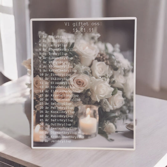 Bryllupsdager fra 1 til 70 år – Den komplette oversikten på en elegant bildeplate