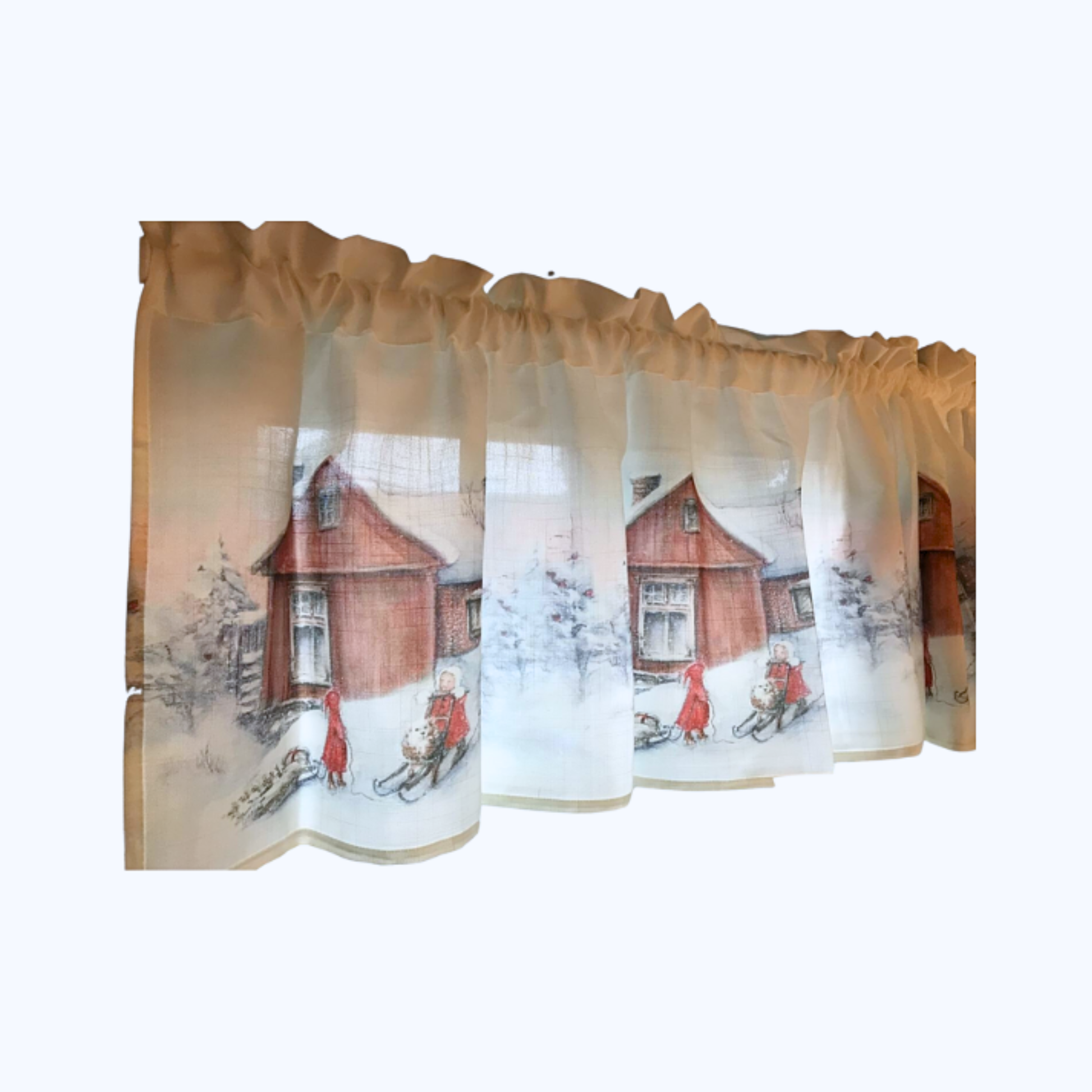 Enten det er i stuen, spisestuen eller barnerommet, vil denne gardinkappen med motiv av den røde låven og vinterlek skape et hjertevarmt og sjarmerende uttrykk. Legg til en nostalgisk følelse av vintermagi til hjemmet ditt med denne nydelige gardinkappen, og la det være et kunstnerisk uttrykk for koselige stunder og fellesskap.