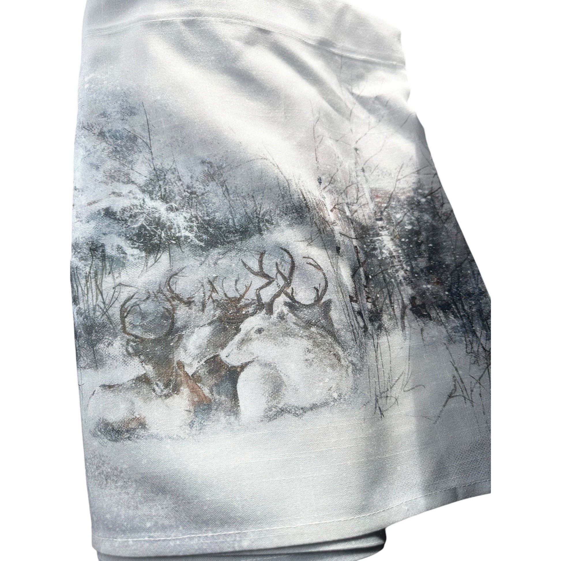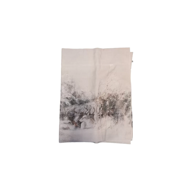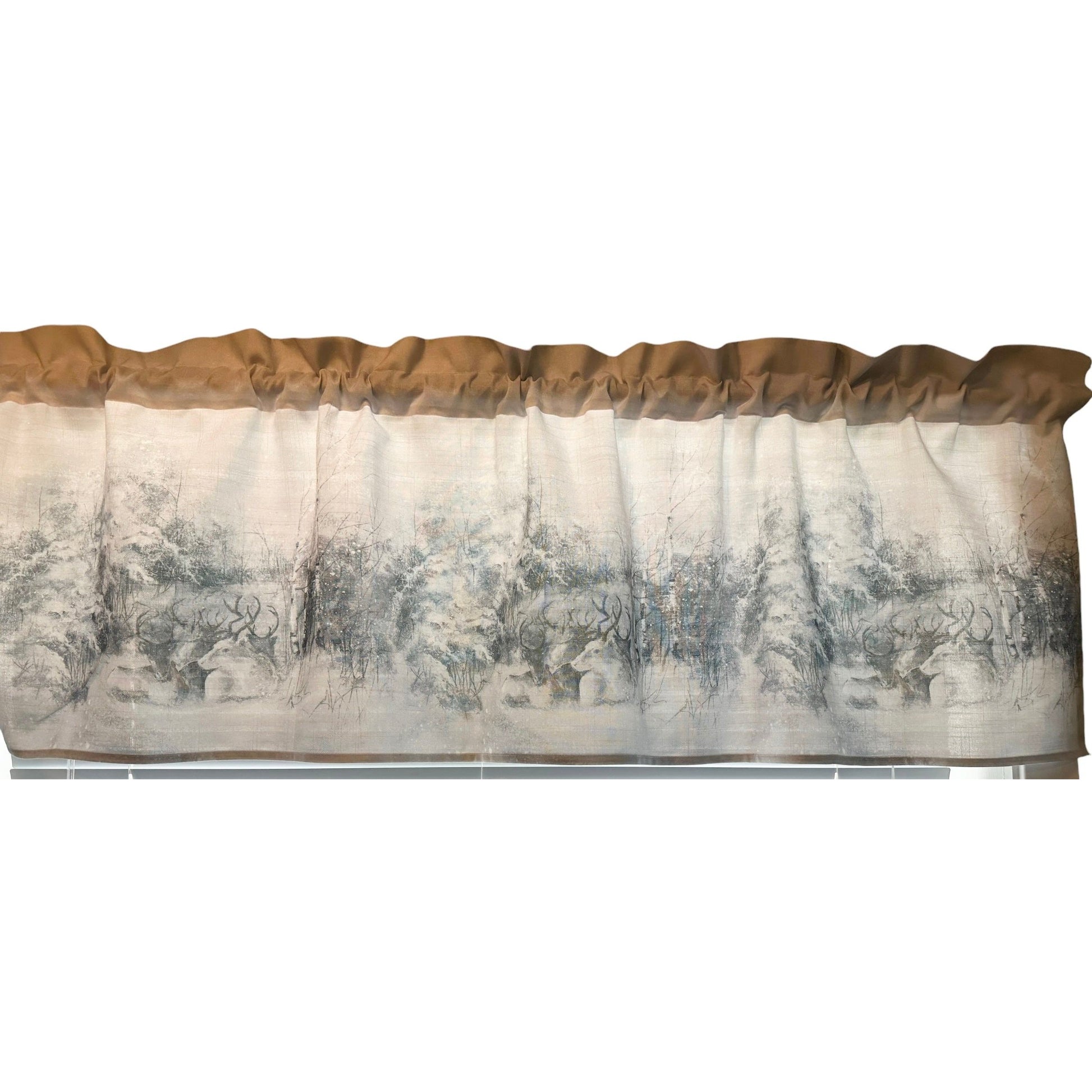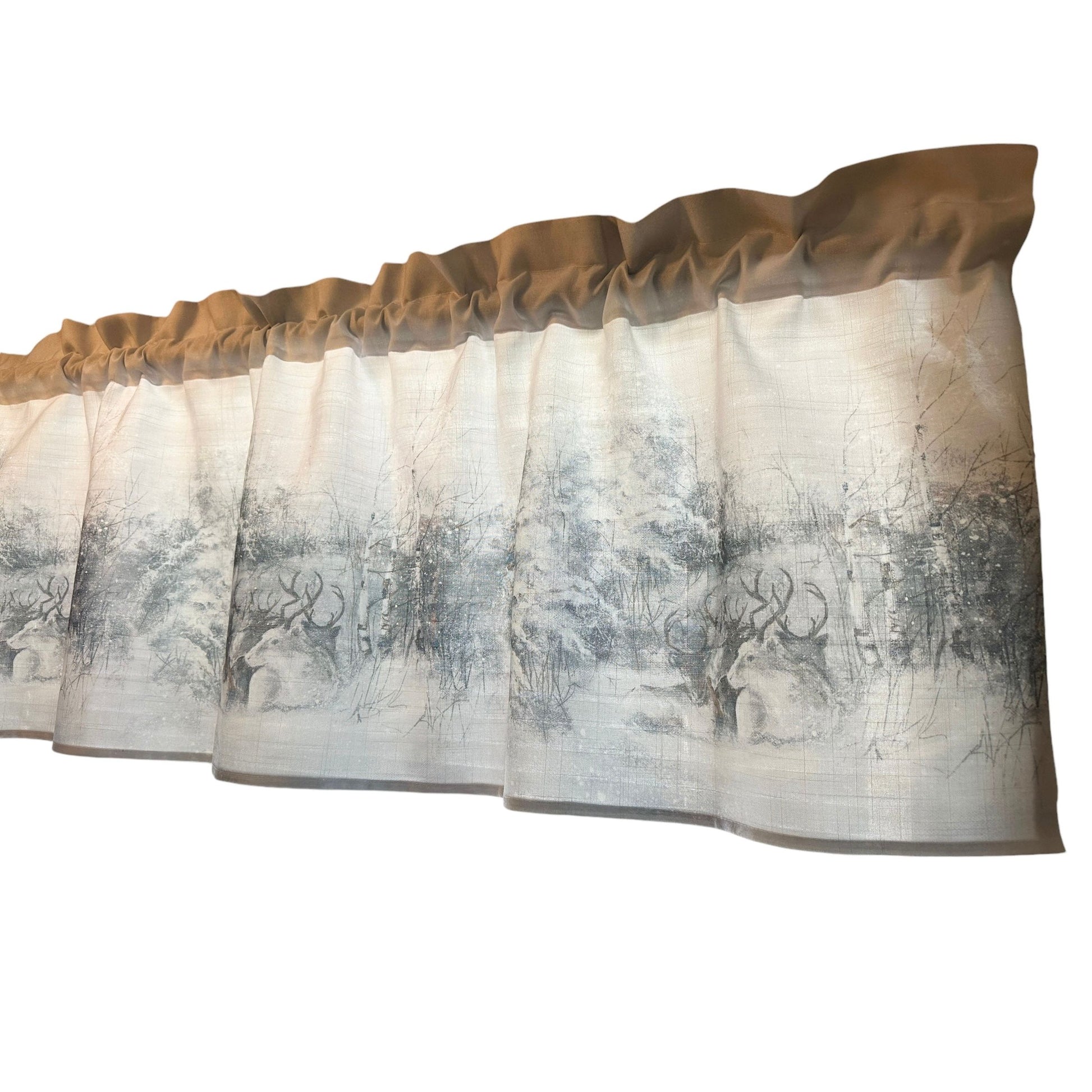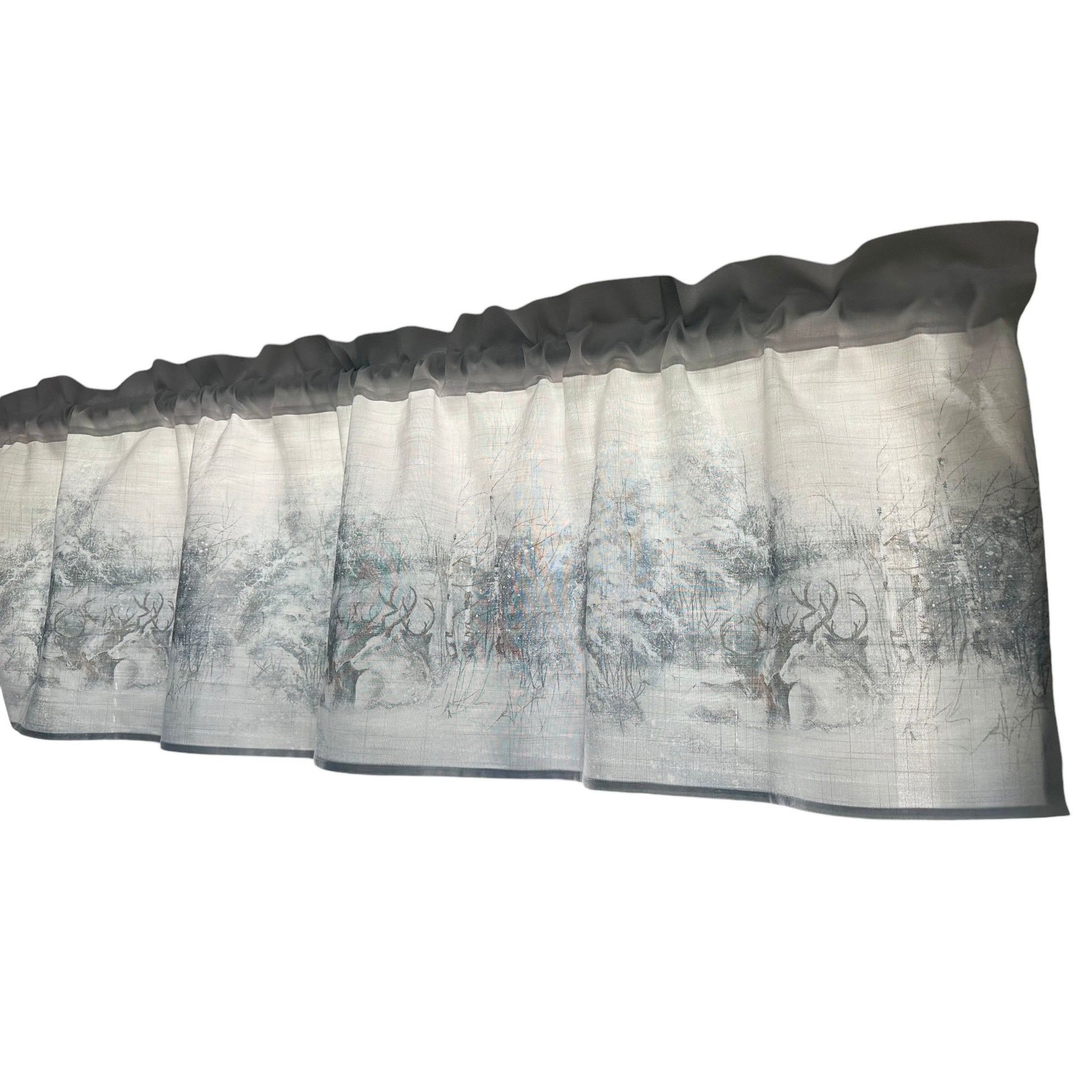 Skap en stemning av vintermagi og naturlig skjønnhet i ditt hjem med vår forseggjorte gardinkappe, vakkert dekorert med et sjarmerende motiv av et snødekket vinterlandskap og elegante reinsdyr. Denne gardinkappen er ikke bare en praktisk tillegg til vindusdekorasjonen, men også et kunstnerisk uttrykk som bringer den fortryllende følelsen av vinteren inn i ditt hjem.