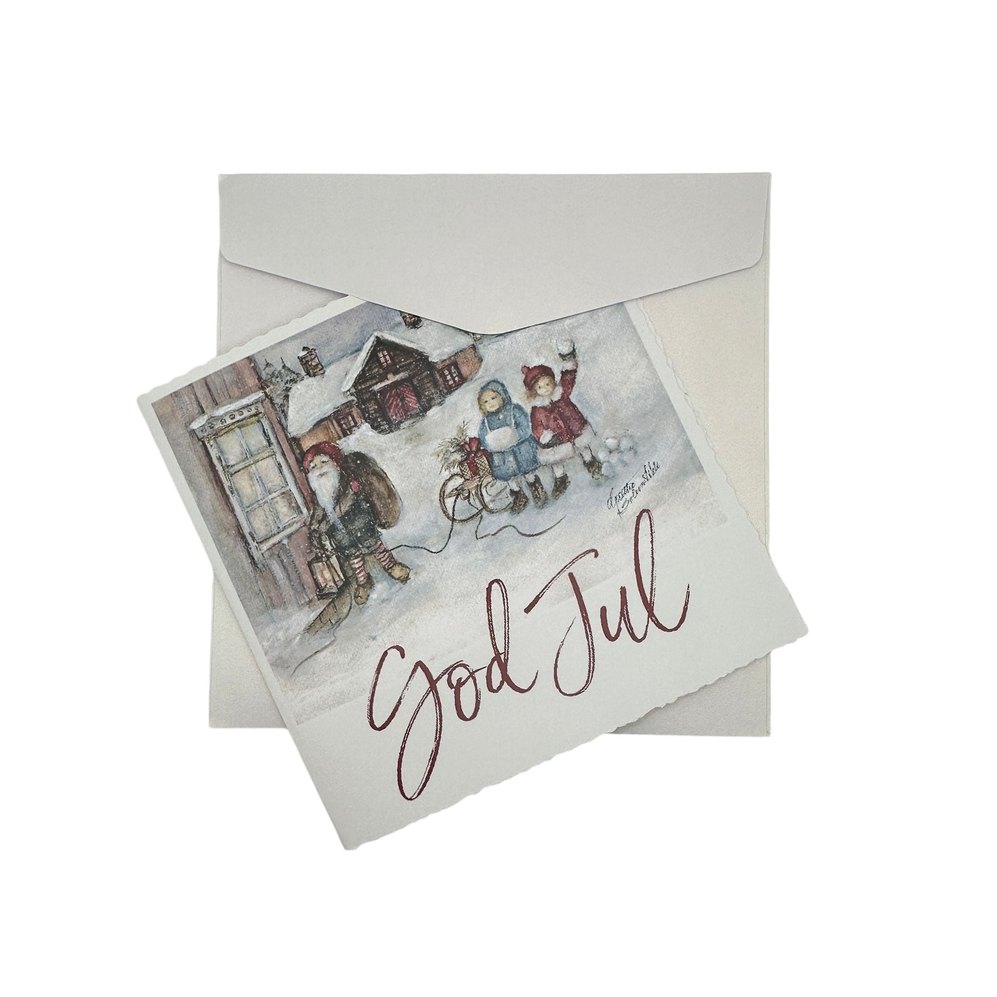 Gjør årets julehilsener ekstra spesielle med våre vakre julekort, komplett med matchende konvolutt, inspirert av Grethe Solemsløkks nostalgiske vintermotiver. Hvert kort fanger den unike magien fra snøkledde Røros og bringer med seg den varme julestemningen som vi alle lengter etter i høytiden. Med detaljer som minner om barndommens julegleder og vintersesongens ro, er disse julekortene perfekte for å sende en personlig og hjertevarm hilsen til noen du er glad i. Den medfølgende konvolutten gir det lille ekstra, og sørger for at din hilsen blir mottatt med stil og sjarm.