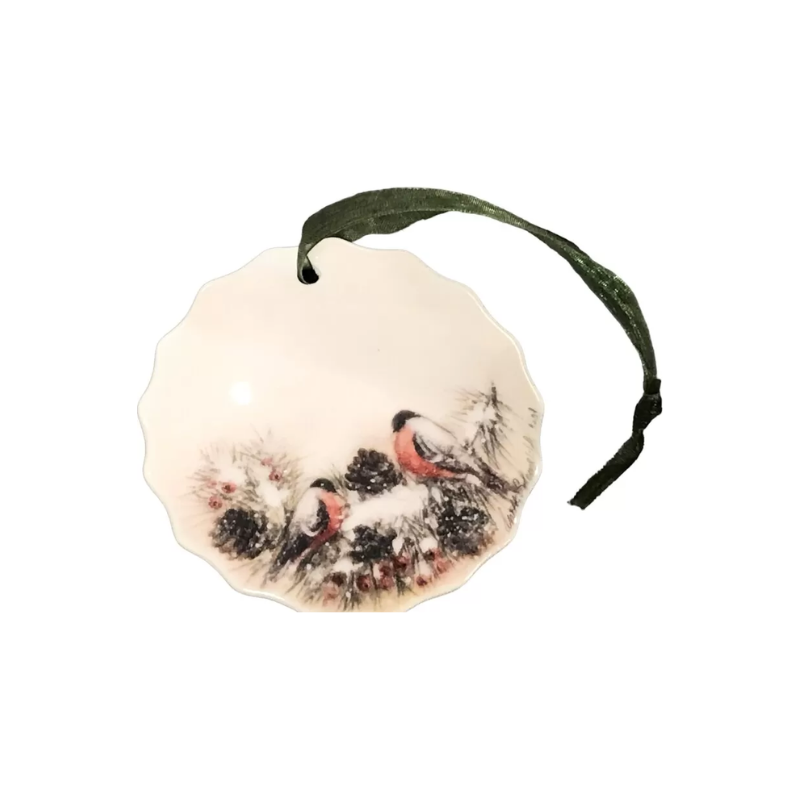 Elegant julepynt i porselen malt av Grethe i typisk nostalgisk stil. Kommer med Grønn eller Rød sløyfe. Dompap på konglebusk