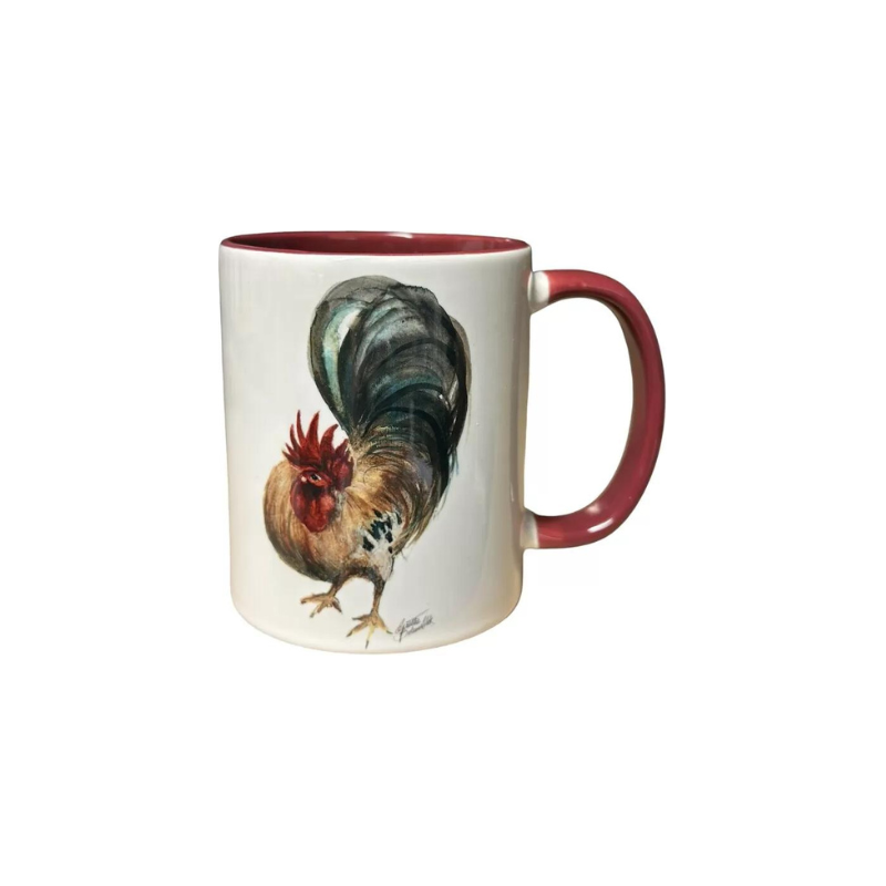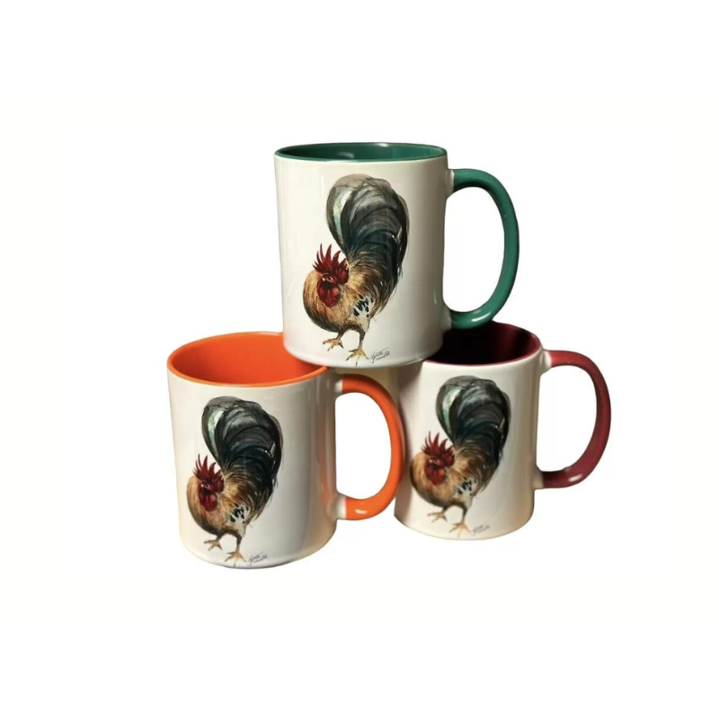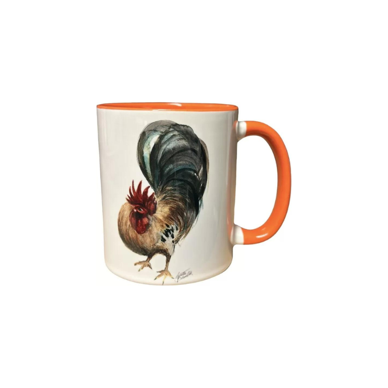 Kruset er farget inni og på hanken, utsiden er dekorert med "Den stolte hane" malt av Grethe og finnes i 3 ulike farger