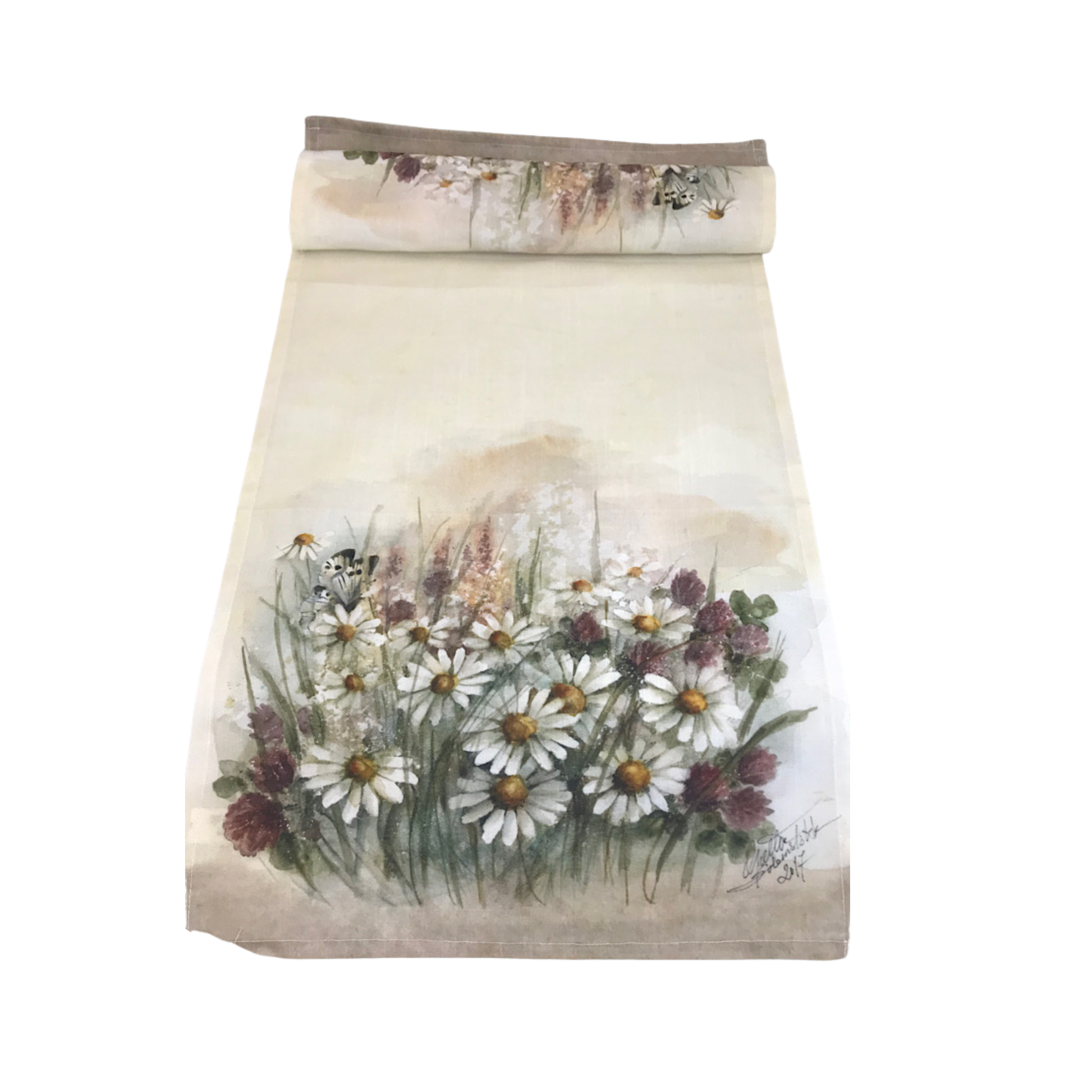 Motivet er nøye malt for hånd, og det fanger essensen av prestekrager med deres hvite kronblader og grønne stengler. Hvert penselstrøk gjenspeiler nøye observasjon av blomstene, og det håndmalte preget gir løperen en unik og kunstnerisk kvalitet.