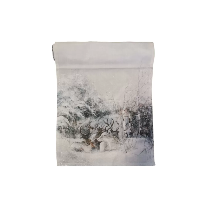 En løper med motivet av tre reinsdyr hvilende i et vinterkledd skogkratt, fylt med vinterens magi, ville være en nydelig og stemningsfull tilføyelse til hjemmet ditt.