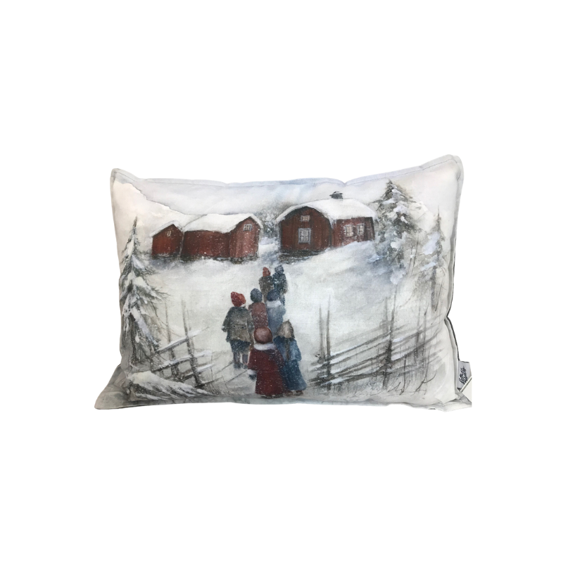 Fargene på puten er som en palett hentet fra vinterens egen fargeskala - myke blå, hvite og jordtoner som skaper en beroligende atmosfære og gir deg følelsen av å vandre gjennom et vinterlandskap selv.