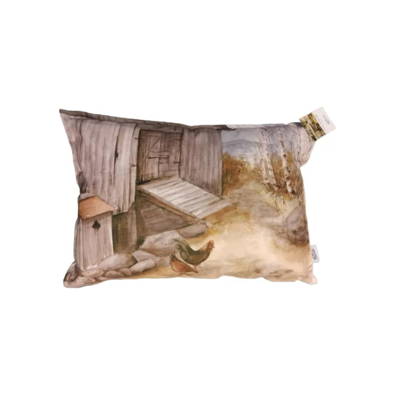 Den subtile fargepaletten og det detaljerte maleriet gir en varm og inviterende atmosfære til ethvert rom, og putetrekket blir et vakkert blikkfang på sofaen, sengen eller en stol. La denne puten med hønsehusmotivet være en kilde til varme og hygge. Gi rommet ditt et preg av landlig sjarm med dette kunstnerisk utformede elementet som vil berike dine stunder av avslapning og komfort.