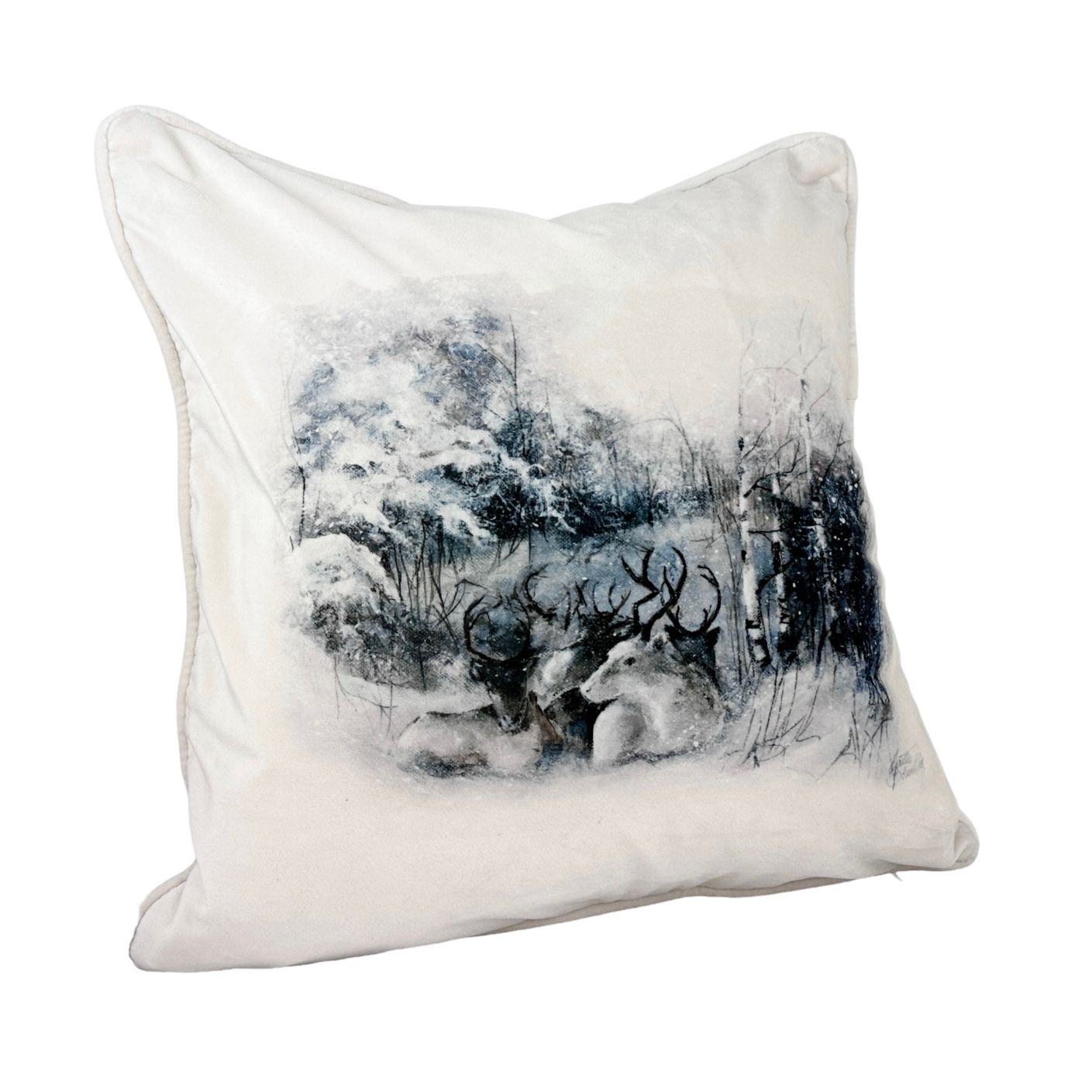 Et putetrekk med motivet av tre reinsdyr hvilende i et vinterkledd skogkratt, fylt med vinterens magi, ville være en nydelig og stemningsfull tilføyelse til hjemmet ditt.