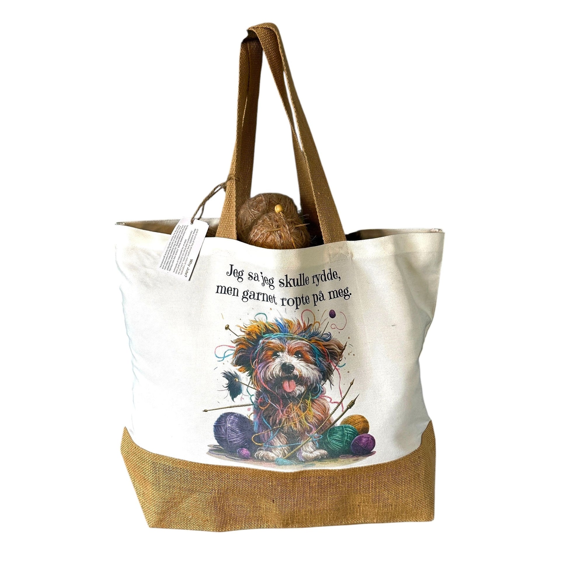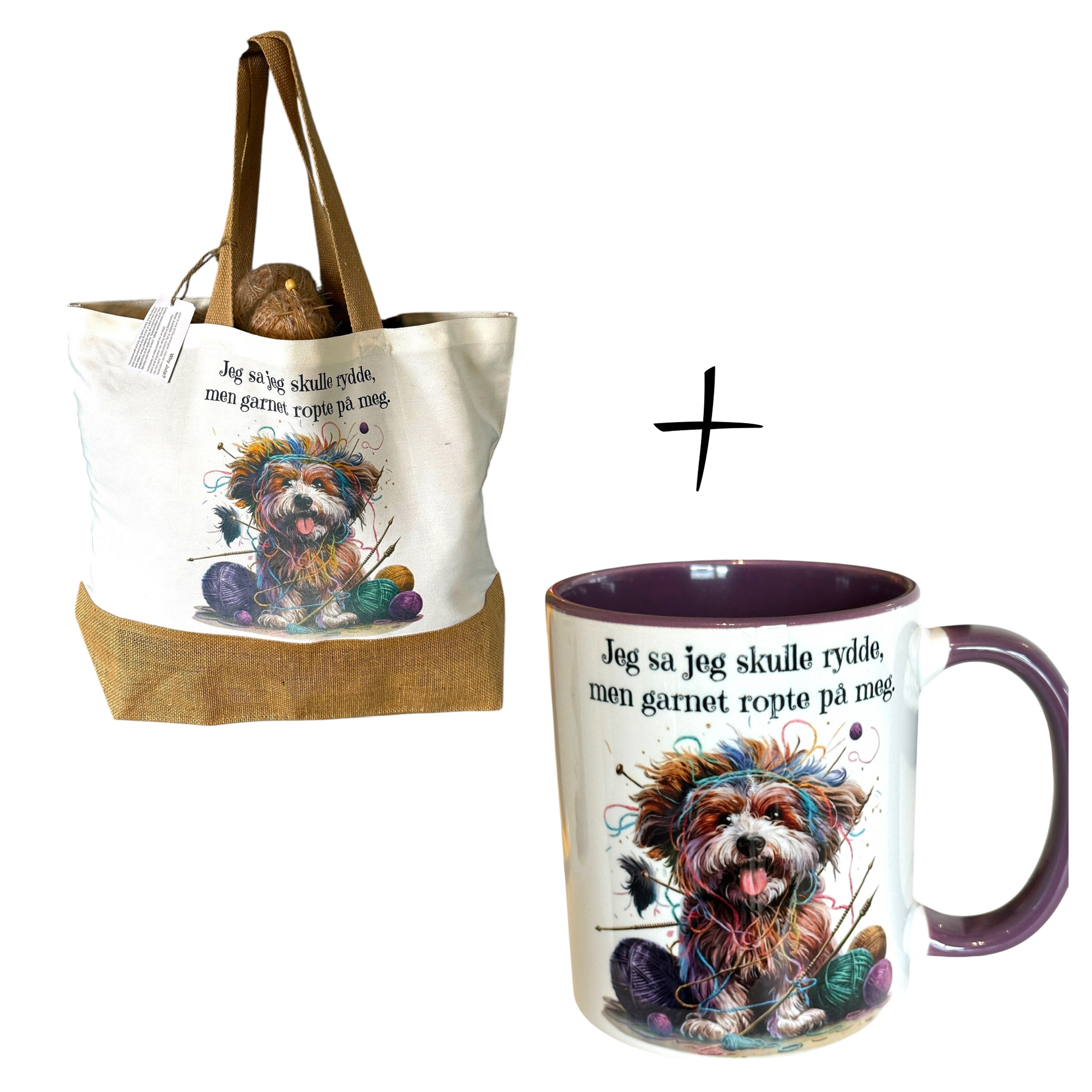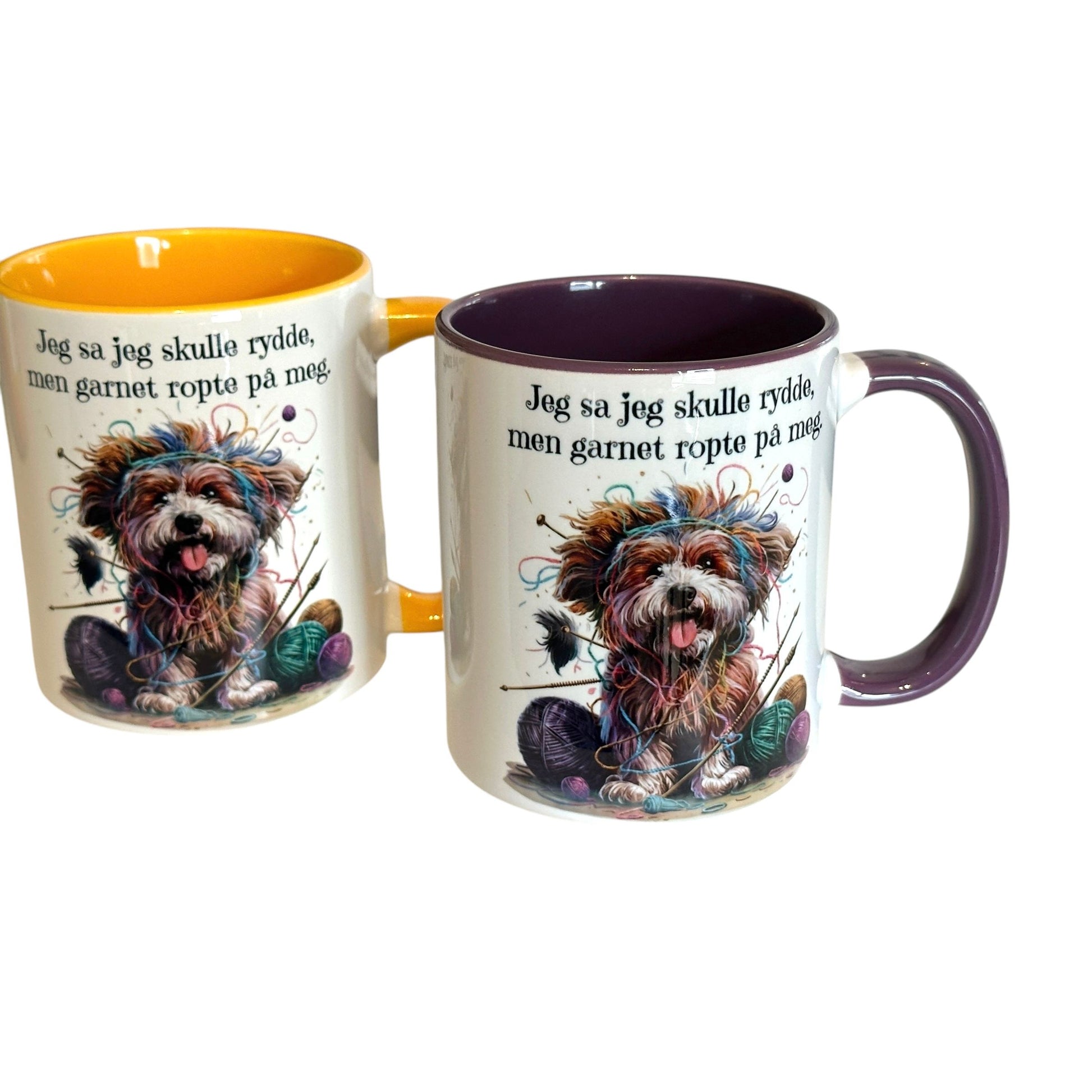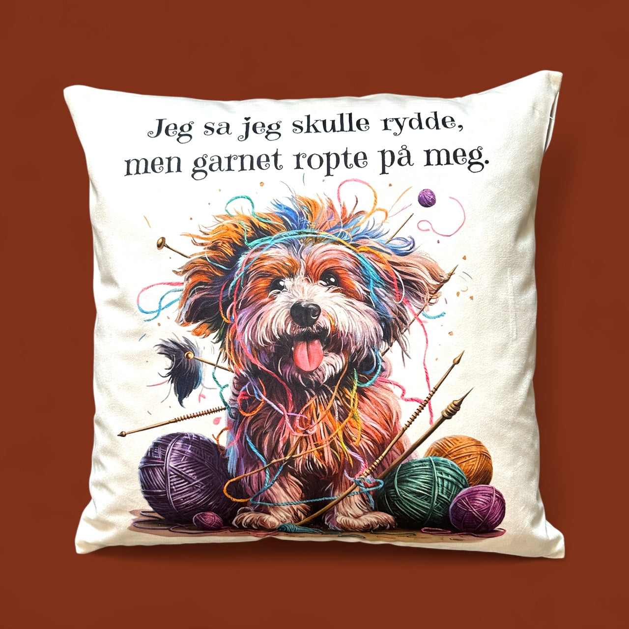 Dette putetrekket i deilig, myk fløyel (100% polyester) byr på et lekent hundemotiv, garnnøster i herlige farger og teksten: «Jeg sa jeg skulle rydde, men garnet ropte på meg.» Perfekt til strikkehjørnet, sofakroken eller lesestolen – der hverdagen gjerne får være litt uperfekt og veldig koselig.