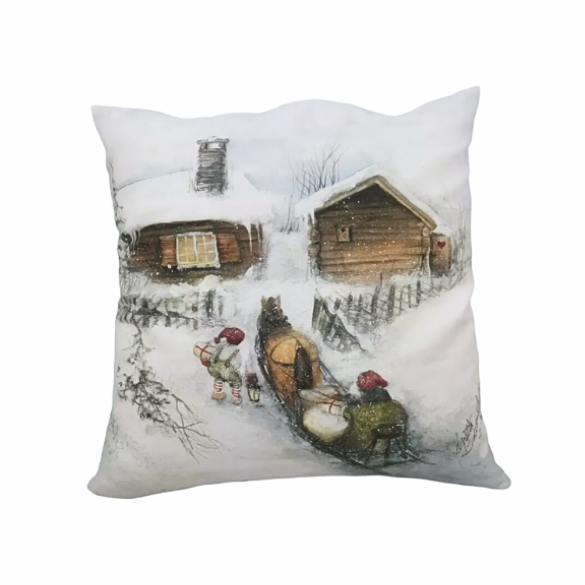 Fargepaletten er inspirert av vinterens ro og skjønnhet. Myke blåtoner og hvite nyanser skaper en atmosfære av trygghet og hygge. De varmere tonene fra nissenes klær og hyttenes glød gir bildet en følelse av liv og varme.