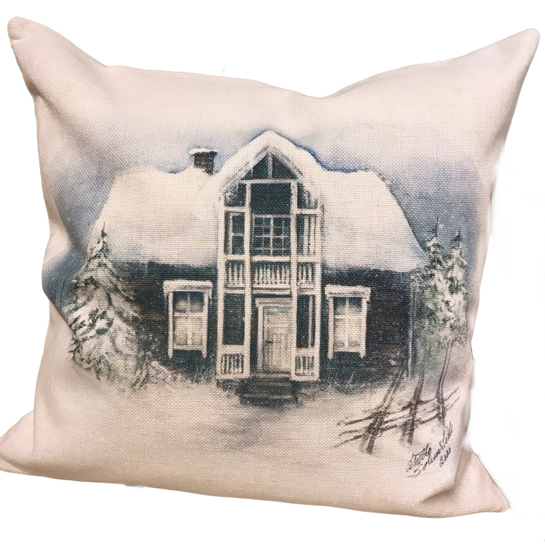 Koselig putetrekk i "linstruktur" med motivet "Vinterhuset".