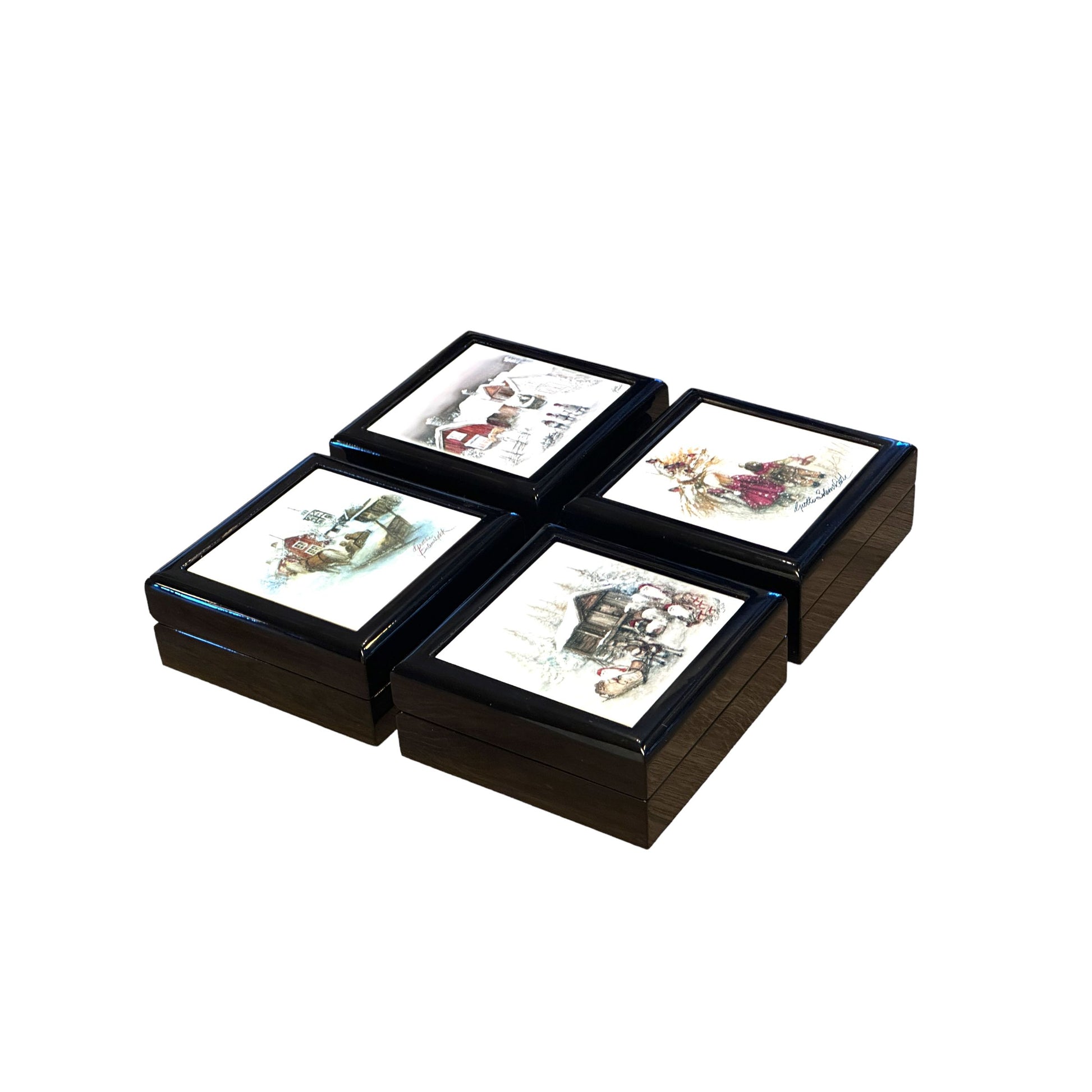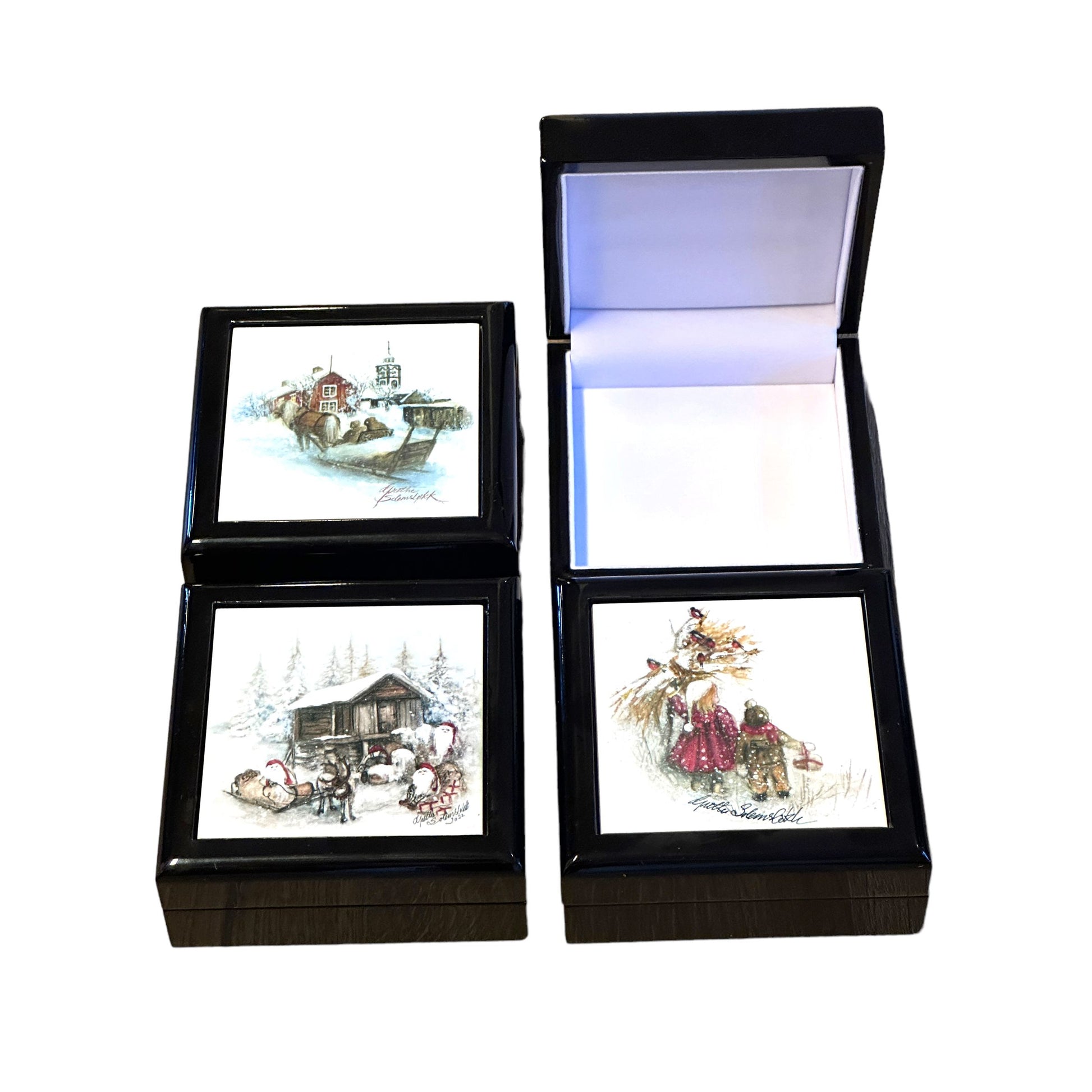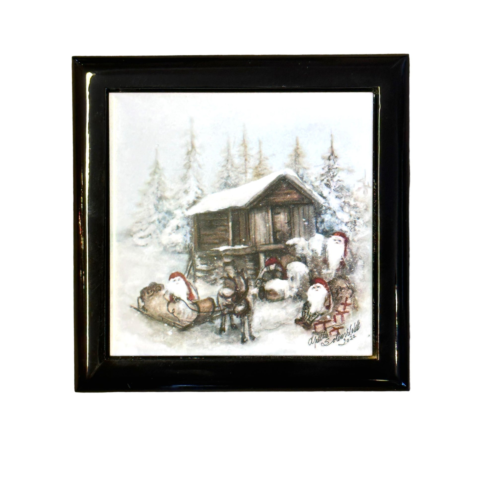Sortmalt skrin i tre med keramiskflis, hvit fløyel på innsiden, lekkert dekorert med et av Grethes fineste nissemotiver "Nissefest på stabburet".