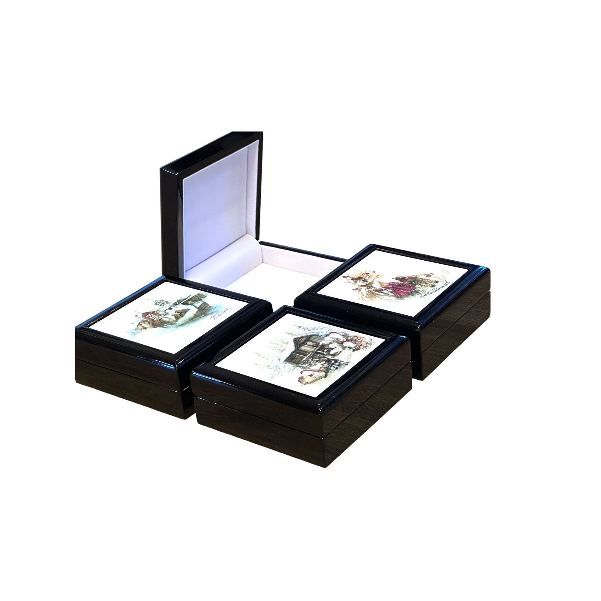 Vårt fortryllende smykkeskrin, kunstnerisk dekorert med et håndmalt nostalgisk motiv av nisser og et sjarmerende stabbur. Dette unike smykkeskrinet gir en følelse av magi og nostalgi, og det er det perfekte stedet å oppbevare dine kjæreste smykker.