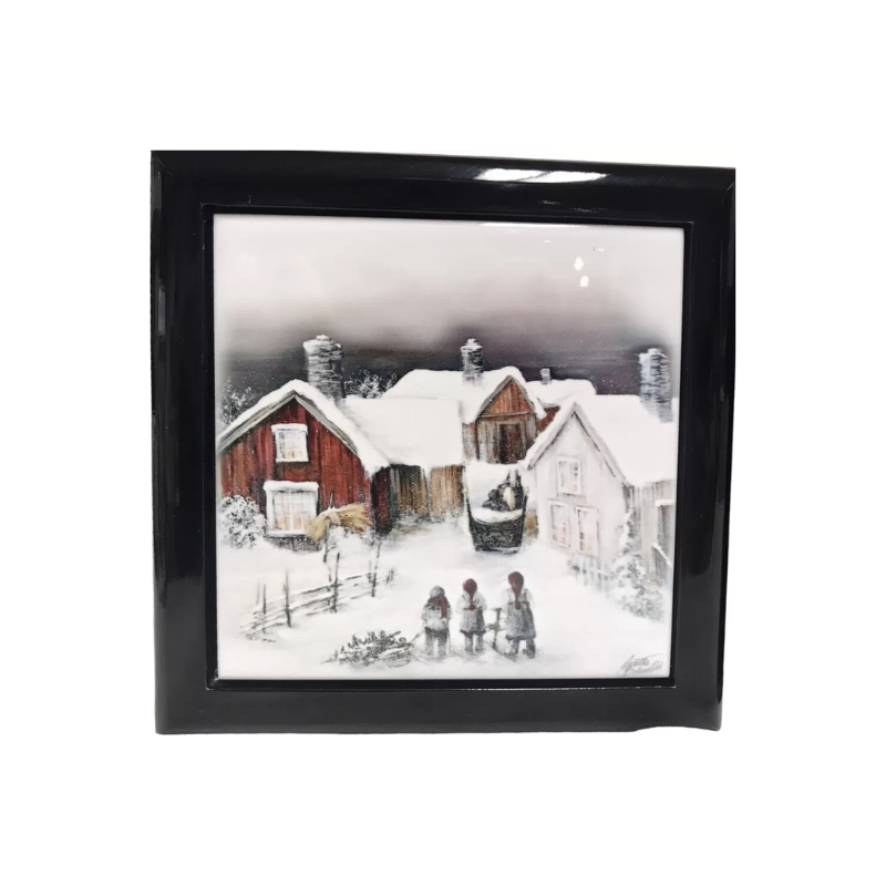 Sortmalt skrin i tre med keramiskflis, hvit fløyel på innsiden, lekkert dekorert med et av Grethes fineste vintermotiver "Vintria".